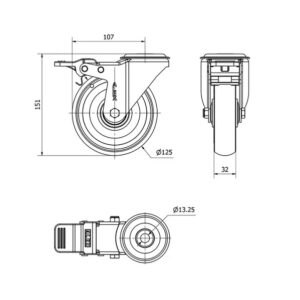 Rueda poliuretano giratoria con freno Alex diametro 125 mm. 2-0582