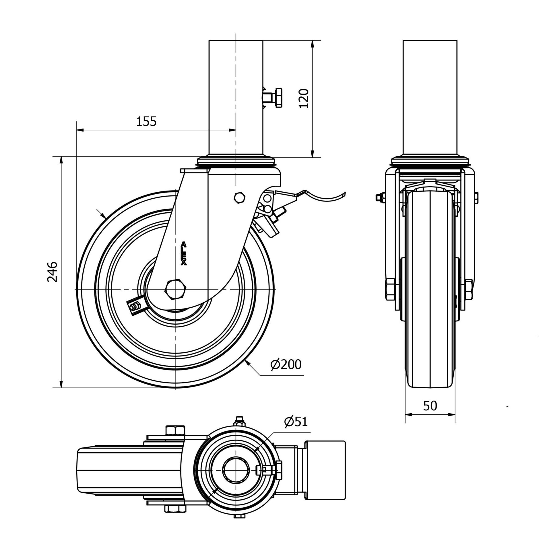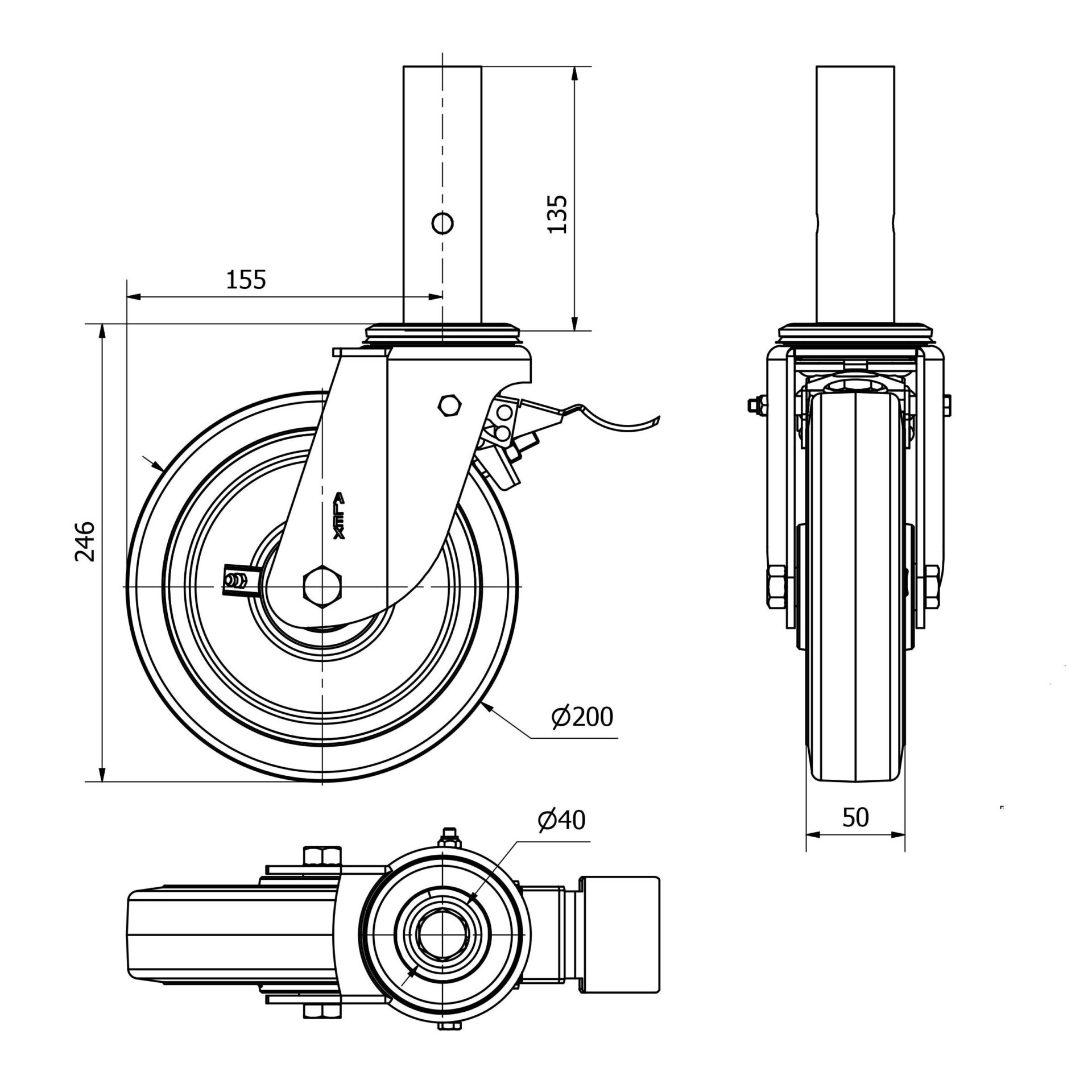 Rueda goma giratoria con freno Alex diametro 200 mm. modelo 2-0905
