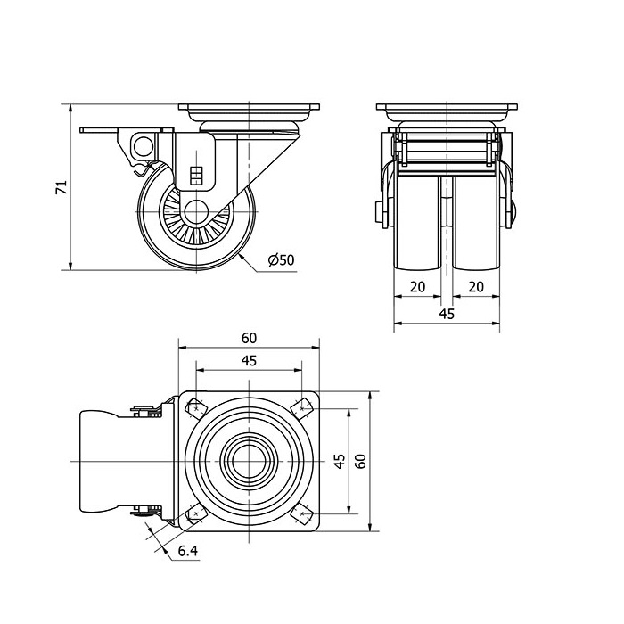 Rueda goma giratoria Alex diametro 50 mm. modelo 1-0780