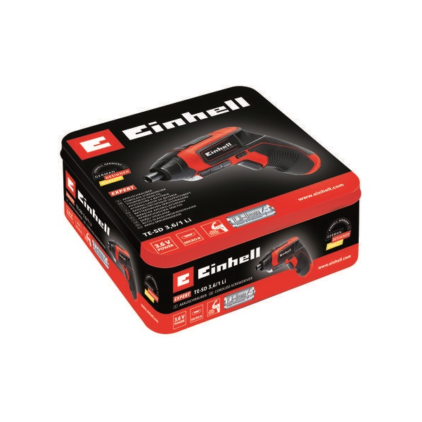 El destornillador inalámbrico Einhell TE-SD 3,6/1 Li, además de ser cómodo de sujetar, despliega toda su potencia con solo tocar un botón. El cambio de brocas es rápido e intuitivo gracias al soporte magnético para brocas de 6,35 mm./¼». Su iluminación Led integrada permite trabajar de manera óptima en zonas oscuras. Su diseño ergonómico y la empuñadura Softgrip para uso continuo ofrecen una máxima manejabilidad y un trabajo sin esfuerzo. El destornillador inalámbrico está equipado con un juego de brocas de diez unidades y, por tanto, viene listo para usar. Su robusta caja de engranajes de metal garantiza la máxima durabilidad. El práctico destornillador inalámbrico se guarda en muy poco tiempo, ya que incluye una caja de metal de alta calidad para un almacenamiento seguro y a prueba de golpes. El destornillador inalámbrico siempre está listo para usar gracias a la tecnología de iones de litio sin autodescarga. El equipamiento incluye la batería de 3,6 voltios / 1500 mAh. con carga avanzada a través del cargador de puerto micro USB.