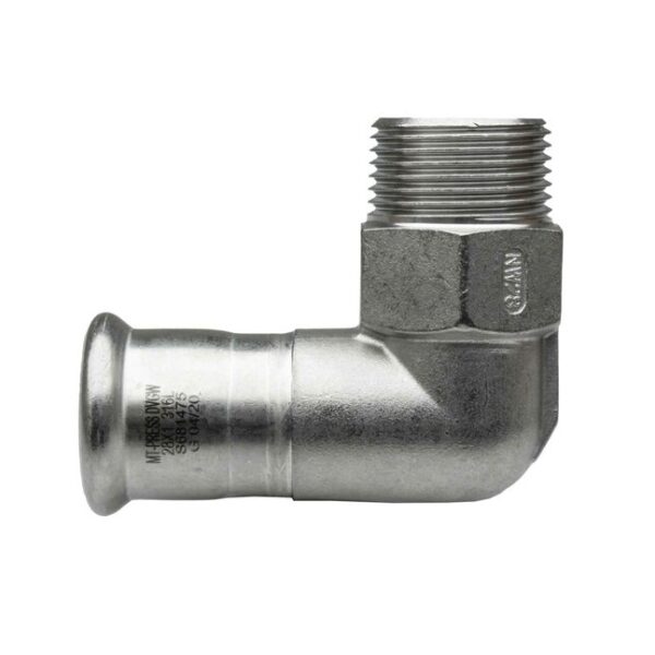 Codo 90º rosca macho prensar hembra acero inoxidable A-316L 3/4″ D-22 mm.