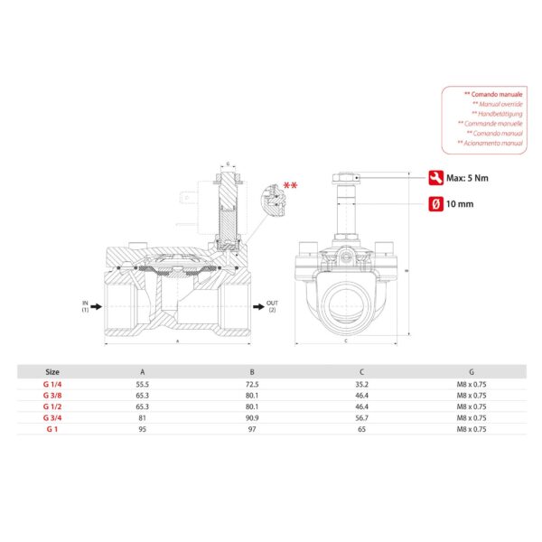 Electrovalvula Aignep servoaccionada 2/2 N.C. 1/4″ laton NBR 10 mm. 04F03110NH