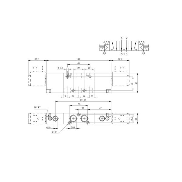 Electrovalvula asistida Aignep monoestable 5/3 O.C. 1/4″ retorno muelle 01VA07OC03