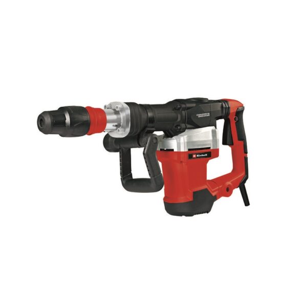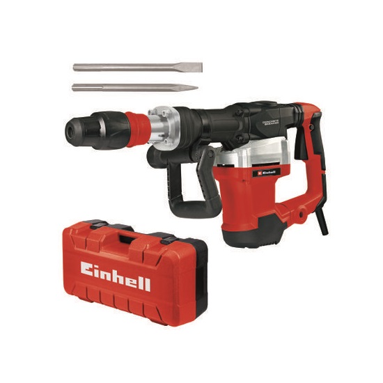 El martillo demoledor Einhell TE-DH aplica 1.500 watios en el cincel y con ello obtiene una elevada potencia de demolición de 32 Julios de intensidad de impacto individual. El martillo de demolición se usa luego cuando se debe ir a la sustancia al romper, demoler o desgarrar materiales duros: piedra, hormigón o ladrillo. El martillo de demolición es una construcción diseñada para una durabilidad con duro funcionamiento continuo: El robusto portaherramientas SDS-max proporciona un cambio de herramienta rápido y sencillo. El cable de goma de 4 metros permite la mayor movilidad posible. La fuerza del usuario se cuida gracias al trabajo con bajo nivel de vibraciones con la ayuda de la empuñadura principal amortiguadora de vibraciones. Además las inserciones de agarre suave amortiguan las vibraciones también en la empuñadura auxiliar regulable en 180° verticalmente / 360° horizontalmente. Las escobillas de carbón con apagado automático evitan un defecto en el dispositivo en el caso de sobrecarga. El martillo de demolición está listo para el uso de forma inmediata gracias al cincel puntiagudo y plano, que están incluidos en el envío en el práctico maletín de transporte y almacenamiento E-Box.