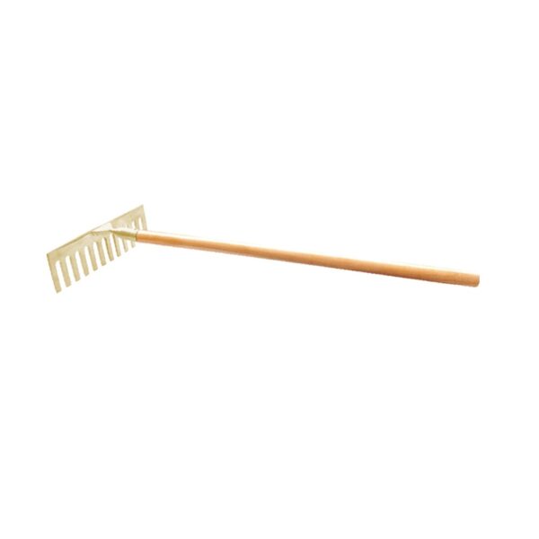 Rastrillo antichispa con mango de madera, concebido para su uso en entornos potencialmente explosivos, al estar fabricado en aleación de aluminio-bronce.