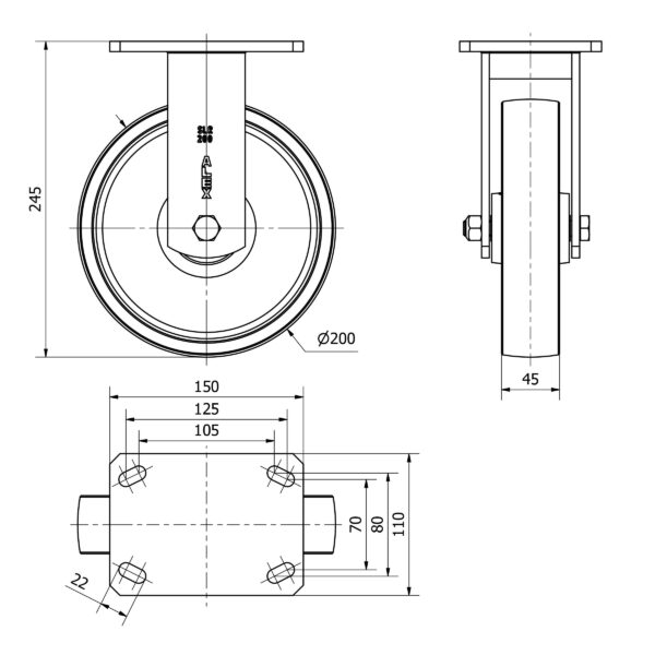 Rueda acero fija Alex diametro 200 mm. modelo 2-3687