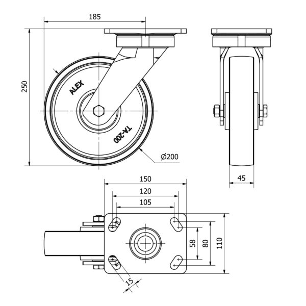 Rueda acero giratoria Alex diametro 200 mm. modelo 4-0380