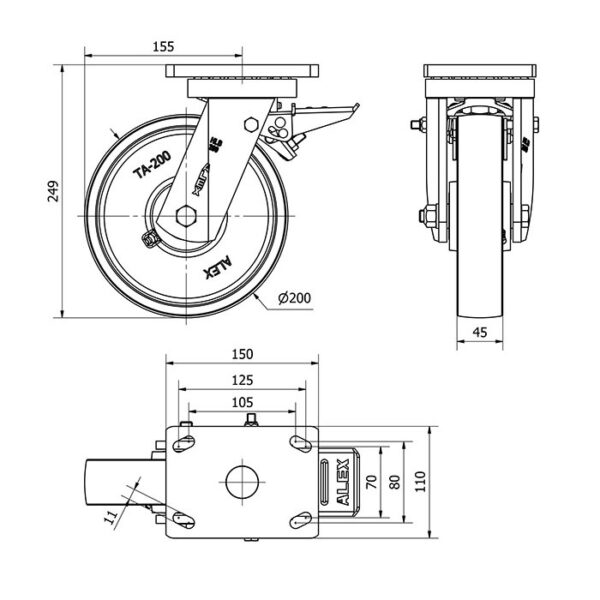 Rueda acero giratoria con freno Alex diametro 200 mm. modelo 2-1543