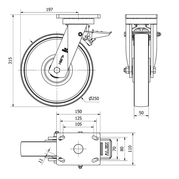 Rueda acero giratoria con freno Alex diametro 250 mm. modelo 2-2305