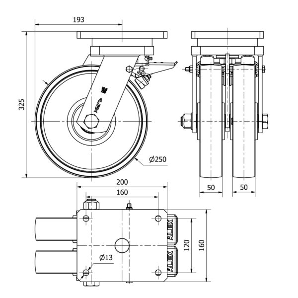 Rueda acero giratoria con freno Alex diametro 250 mm. modelo 2-3824