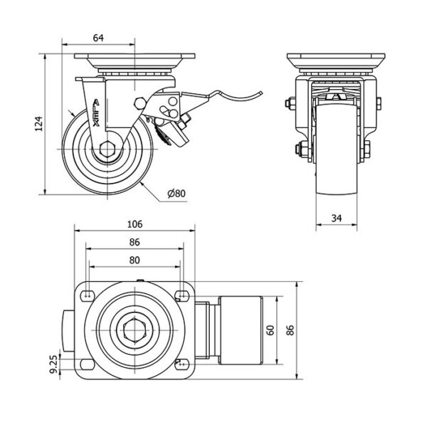 Rueda acero giratoria con freno Alex diametro 80 mm. modelo 2-1628 EAN 8422202216287