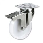 BIPF: Rotantes modelo B de acero inoxidable, con sujeción por pletina y fijos. Soportes de acero inoxidable AISI-304 al niquel-cromo 18/8. Sujeción de los soportes por pletina de 4 agujeros. Horquilla de acero INOX 420B de 2 mm. de espesor.