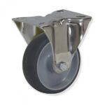 MIPG: Rotantes modelo M en acero inoxidable, con sujeción por pletina y giratorios. Soportes de acero inoxidable AISI-304 al niquel-cromo 18/8. Sujeción de los soportes por pletina de 4 agujeros. Horquilla provista de tornillo y tuerca autoblocante inoxidables A2. Acabados: Pulido brillante. Doble hilera de bolas (de acero inoxidable AISI 420B) protegidas por cazoletas envolventes y junta de retención de grasa. Robusto pivote central (remachado) de acero inoxidable AISI 305.