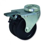 BDPG: Rotantes modelo B con rueda doble, sujeción por pletina y giratorios. Soportes de acero (estampado) de 1,5 mm. de espesor y 2 mm. la pletina. Cabeza giratoria con doble hilera de bolas (de acero al cromo) protegidas por cazoletas envolventes. Acabado del soporte: zincado brillante.