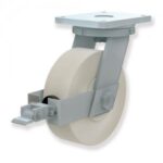 UPG: Rotantes modelo U, sujeción por pletina P y giratorios. Soportes de acero (estampado) y electrosoldado. Sujeción de los soportes por pletina de 4 agujeros. Horquilla provista de tornillo y tuerca autoblocante (calidad 8.8) DIN-933 M-25×140 mm. Casquillos de montaje encajados en los cojinetes. Acabado cincado brillante. Cabeza giratoria de acero forjado y mecanizado, conformada por un rodamiento de bolas de presición (DIN 711) encajado en la pletina y un rodamiento de rodillos cónicos (DIN 720) encajado en la cabeza giratoria, rellena de grasa (totalmente sellada) y provista de engrasador. Robusto pivote central forjado de una pieza con la pletina. Blocaje de la cabeza giratoria por tuerca almenada y pasador que permite el ajuste del juego sin tener que desmotar la rueda. Horquilla de acero estampado electrosoldada (interior y exterior) a la cabeza giratoria.