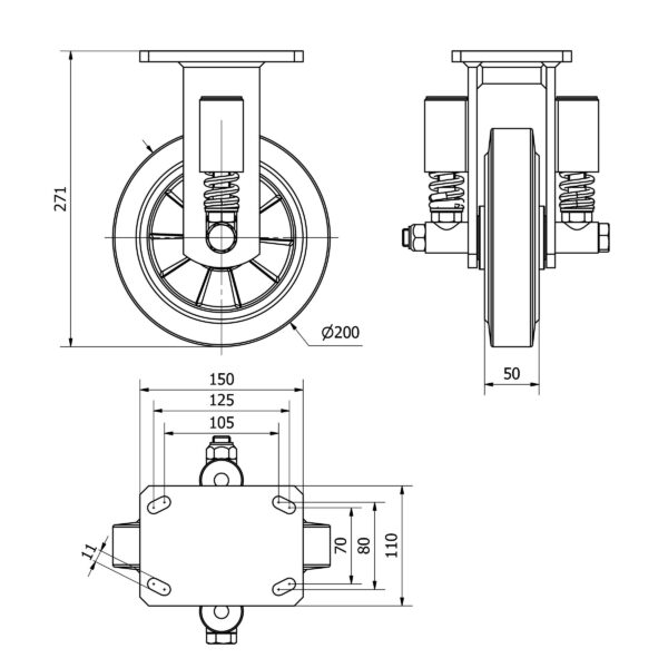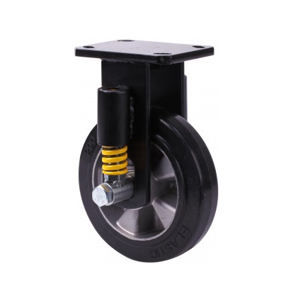 Las ruedas Alex serie HLS-DE son ruedas con el núcleo de aluminio y con la banda de goma negra elástica con una dureza 70? shore A, indicadas para soportar altas cargas hasta 500 Kg. Con soporte de suspensión elástica, mediante incorporación de muelle muy resistente, ideal para suelos irregulares donde su amortiguación actúa. Se utilizan en logística interna, útiles de transporte, aéreas de exteriores, gradas móviles, plataformas elevadoras, carros de transporte, maquinaria pesada y grúas móviles. DE: ideal para el traslado manual de cargas medianas. Silenciosa. Absorbe golpes y vibraciones. Máxima protección de los suelos y del equipo. Ideal para suelos irregulares.