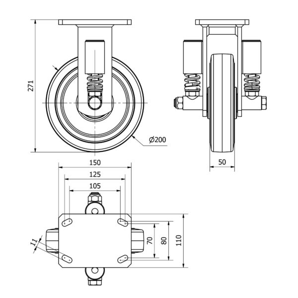 Las ruedas Alex serie HLS-HG son ruedas con el núcleo de acero y con la banda de goma negra natural, indicadas para soportar altas cargas hasta 700 Kg. Con soporte de suspensión elástica, mediante incorporación de muelle muy resistente, ideal para suelos irregulares donde su amortiguación actúa. Se utilizan en útiles de transporte logístico, aéreas de exteriores y grúas móviles. HG: Rueda apropiada para tracción mecánica. Máxima protección de los suelos. Rodadura suave y silenciosa. (Carretillas elevadoras, remolques, etc.). Industria en general.