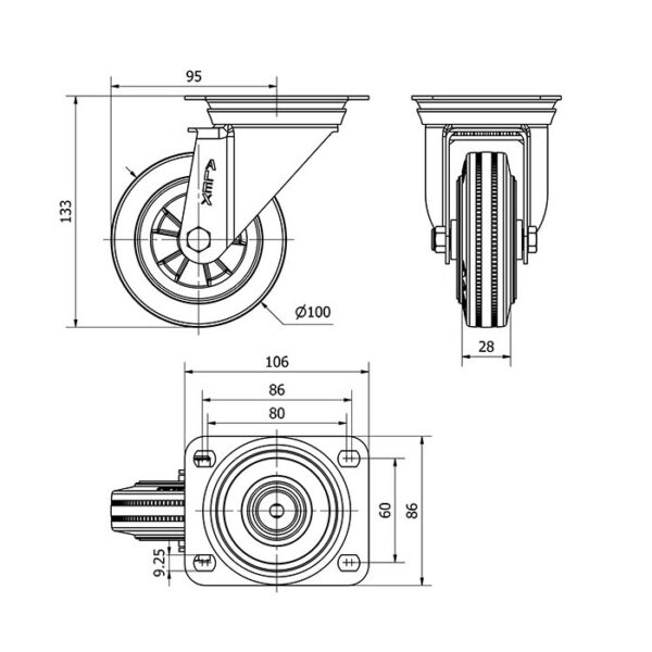 Rueda goma giratoria Alex diametro 100 mm. modelo 2-1670