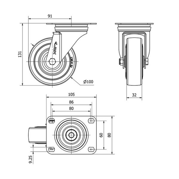 Rueda goma giratoria Alex diametro 100 mm. modelo 2-1724