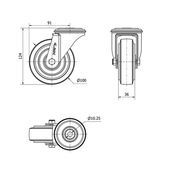 Rueda goma giratoria Alex diametro 100 mm. modelo 2-2741