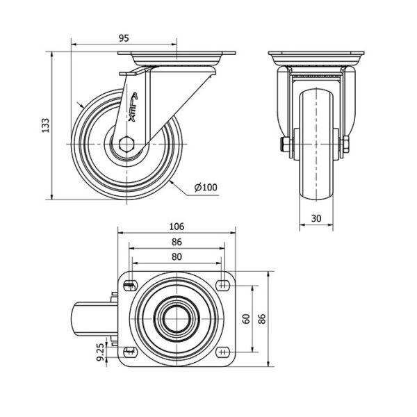 Rueda goma giratoria Alex diametro 100 mm. modelo 2-3214