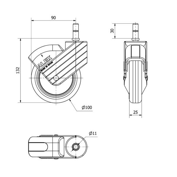 Rueda goma giratoria Alex diametro 100 mm. modelo 2-3323