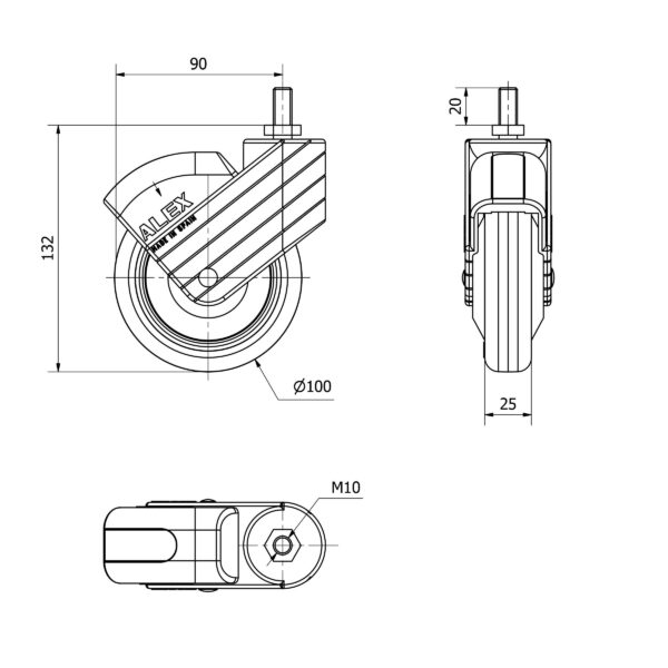 Rueda goma giratoria Alex diametro 100 mm. modelo 2-3325