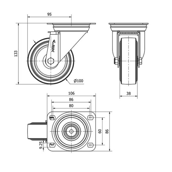 Rueda goma giratoria Alex diametro 100 mm. modelo 2-4440