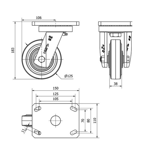 Rueda goma giratoria Alex diametro 125 mm. modelo 2-0454