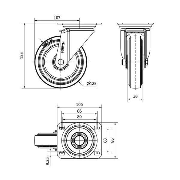 Rueda goma giratoria Alex diametro 125 mm. modelo 2-2726