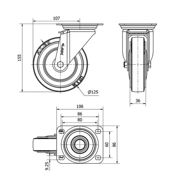 Rueda goma giratoria Alex diametro 125 mm. modelo 2-4457