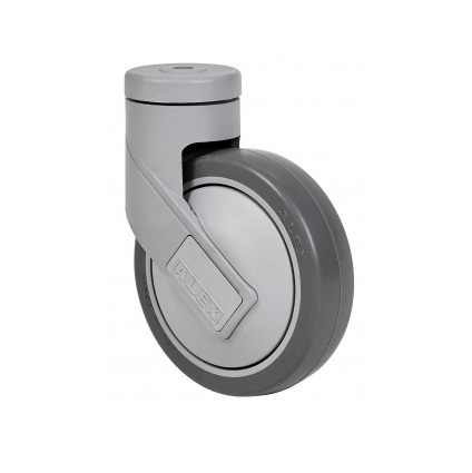 La serie de ruedas Alex HC-PGAIB son ruedas de goma termoplástica gris inyectada, con soporte fabricado en poliamida de alta calidad endurecida con fibra de vidrio, cabezal giratorio superior construido en doble hilera de bolas endurecidas (fijación placa y agujero pasante) y cojinete de bolas de precisión insertado (fijación espiga roscada), indicadas para soportar cargas hasta 100 Kg. Se utilizan en mobiliario clínico-sanitario, salas de operaciones, quirófanos, camas, usos hospitalarios, restauración y cocinas. PGAIB: Silenciosa, absorbe las vibraciones, no deja huella en los pavimentos y de fácil desplazamiento.