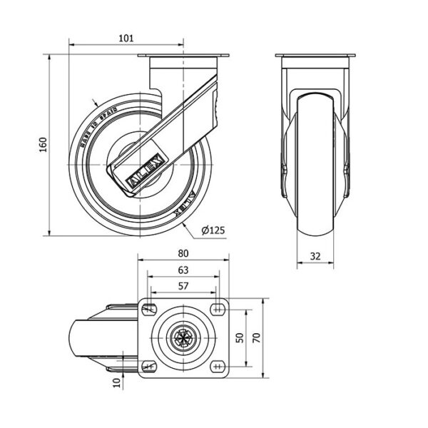 Rueda goma giratoria Alex diametro 125 mm. modelo 2-4641