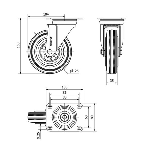 Rueda goma giratoria Alex diametro 125 mm. modelo 2-4838