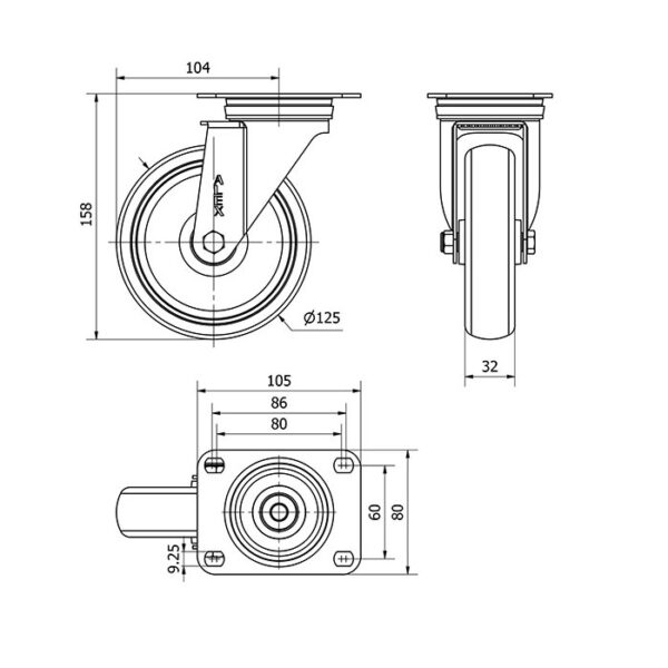Rueda goma giratoria Alex diametro 125 mm. modelo 2-4873