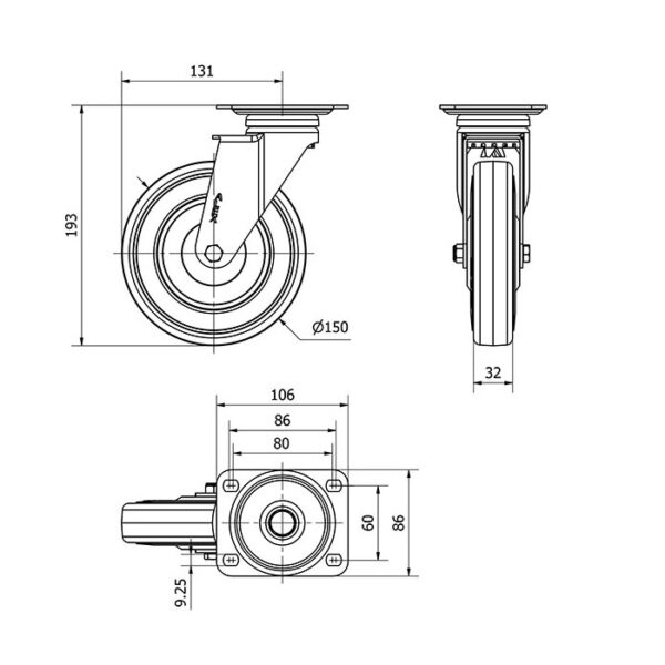 Rueda goma giratoria Alex diametro 150 mm. modelo 2-1227