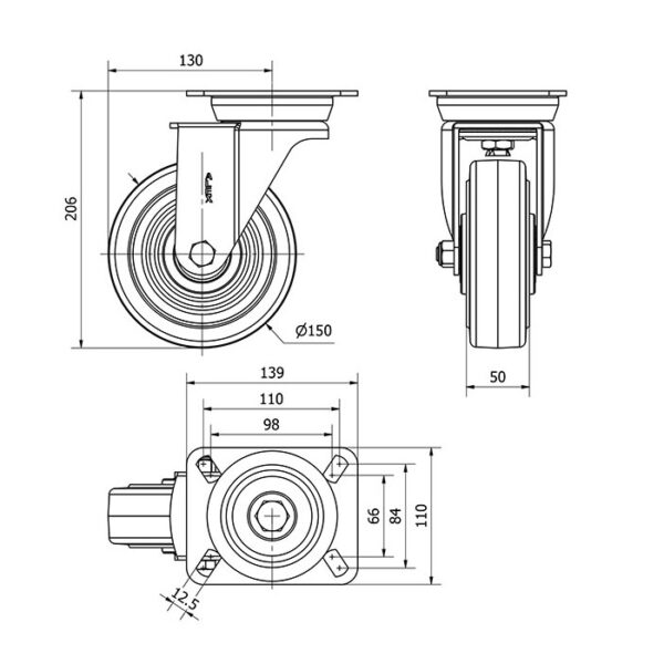 Rueda goma giratoria Alex diametro 150 mm. modelo 2-2049