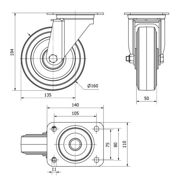 Rueda goma giratoria Alex diametro 160 mm. modelo TW0296