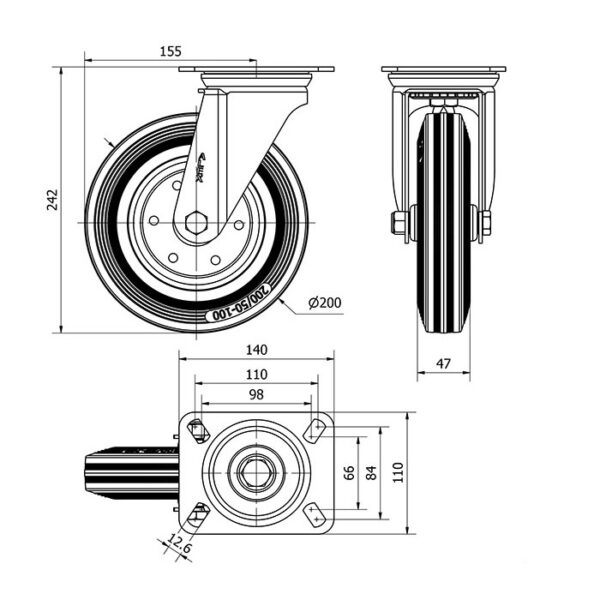 Rueda goma giratoria Alex diametro 200 mm. modelo 2-0233