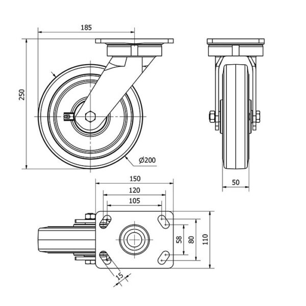 Rueda goma giratoria Alex diametro 200 mm. modelo 2-1969