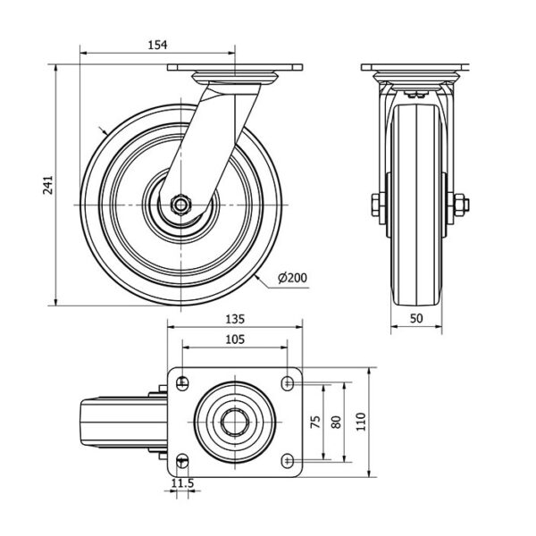 Rueda goma giratoria Alex diametro 200 mm. modelo 2-1983