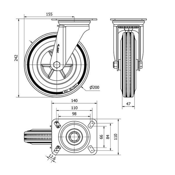 Rueda goma giratoria Alex diametro 200 mm. modelo 2-3401
