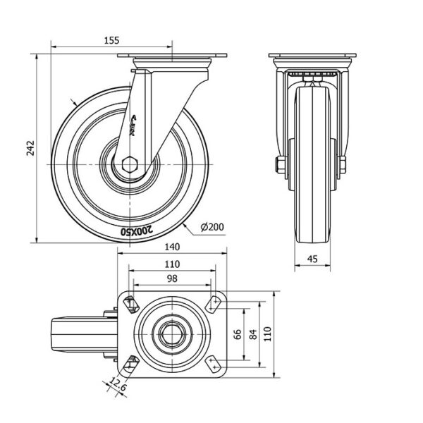 Rueda goma giratoria Alex diametro 200 mm. modelo 2-4468