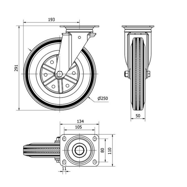 Rueda goma giratoria Alex diametro 250 mm. modelo 2-0245