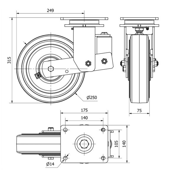 Rueda goma giratoria Alex diametro 250 mm. modelo 2-3936