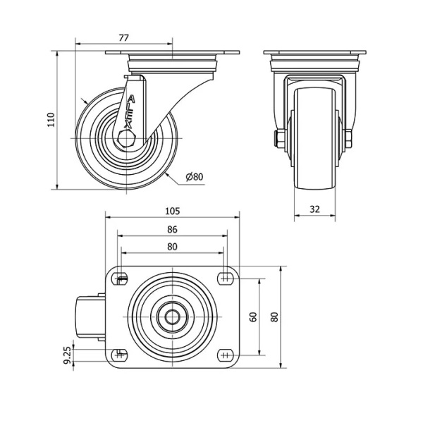 Rueda goma giratoria Alex diametro 80 mm. 2-5182