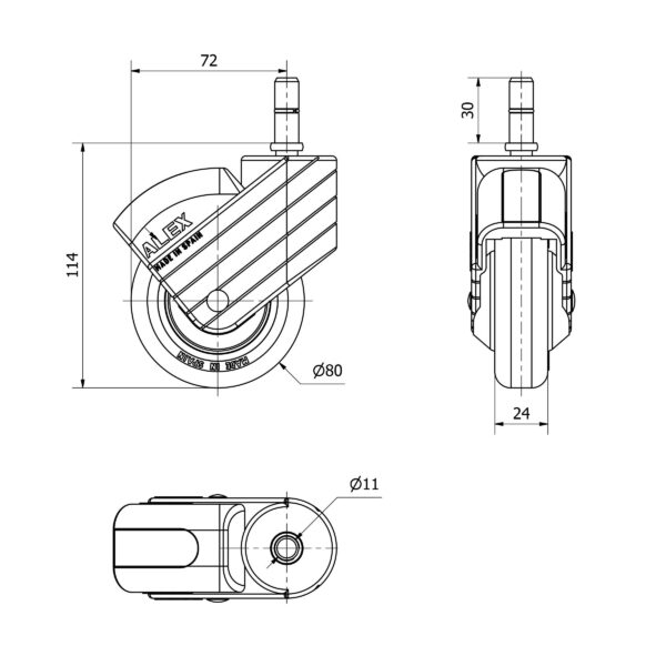 La serie de ruedas Alex HP-PGI son ruedas de poliamix y goma negra, indicadas para soportar cargas hasta 40 Kg. Se utilizan en expositores, muebles, taburetes, restauración, hospitales, útiles, portagoteros, mobiliario clínico sanitario, goteros y carros de limpieza. PGI: No rallan ni manchan el suelo. Aptas para todo tipo de superficies.