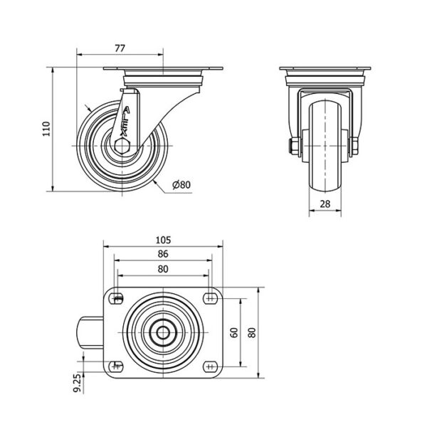 Rueda goma giratoria Alex diametro 80 mm. modelo 2-3260
