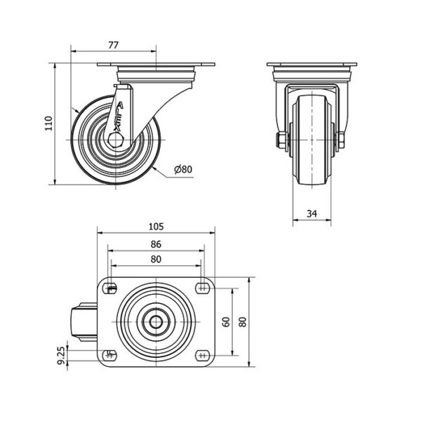 Rueda goma giratoria Alex diametro 80 mm. modelo 2-3497