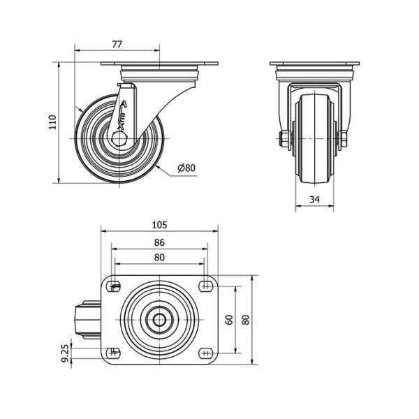 Rueda goma giratoria Alex diametro 80 mm. modelo 2-3751